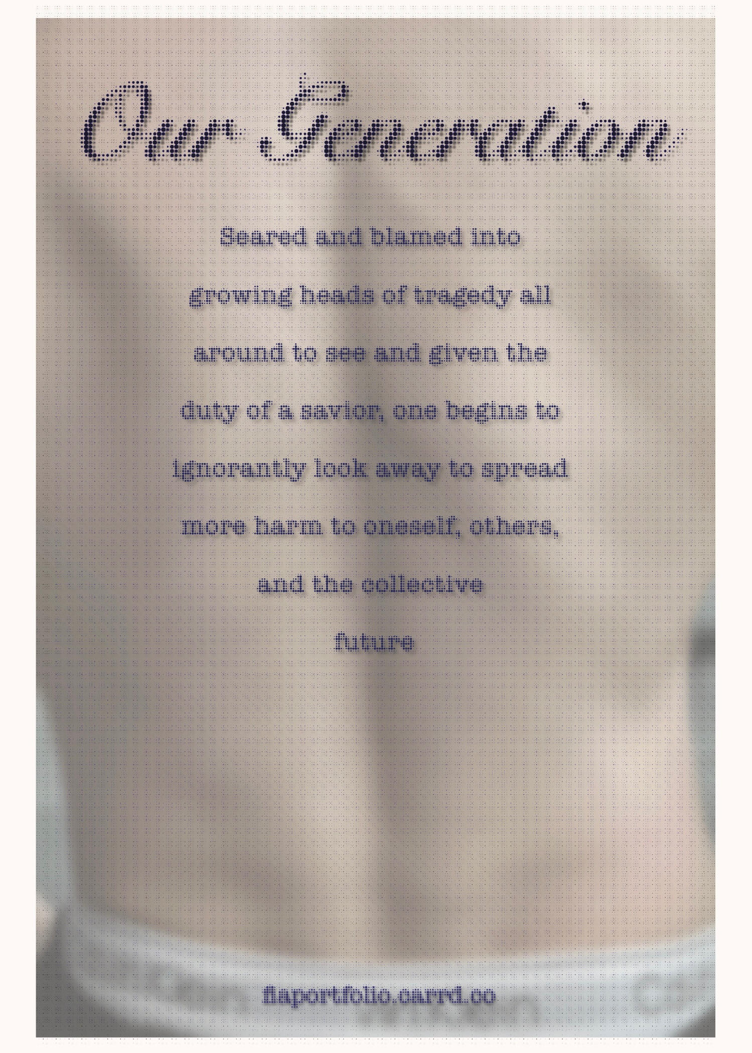 We, the class of ART 295, hosted a group exhibition at our college library for the last week of school. ART 295 was a professional class to help aid and better our skills as artists, students joined from many majors such as fashion, photography, studio art, etc. I, the sole graphic designer in the class, was tasked with creating a flyer to promote our showcase around campus.